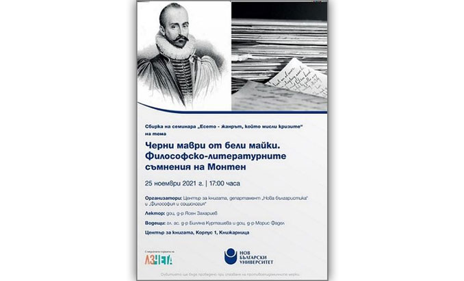 Начало Център за книгата Новини и събития Новини и събития 22 Ноември 2021 Черни маври от бели майки. Философско-литературните съмнения на Монтен Сбирка на семинара „Есето - жанрът, който мисли кризите“ на 25 ноември 2021 г., 17.00 ч., Нов български университет Културни новини