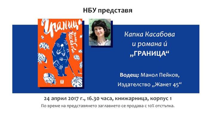 Начало Център за книгата Новини и събития Новини и събития 25 Април 2017 Капка Касабова с „Граница“ гостува в София, Пловдив, Стара Загора, Бургас и Свиленград Първа среща на авторката с читатели е в НБУ. crosspoint.mediabg.eu