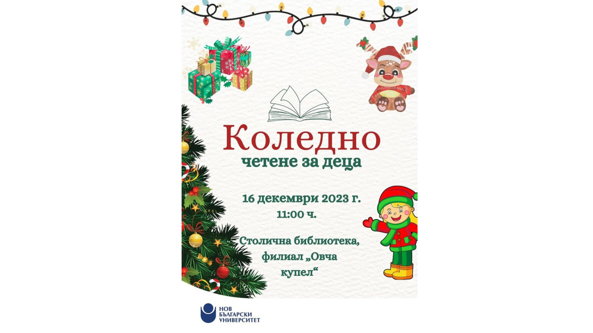 На 16 декември 2023 г. от 11.00 ч. студенти от бакалавърска програма „Връзки с обществеността“ на департамент „Медии и комуникация“ с преподавател гл. ас. д-р Десислава Данкова и Библиотеката на Нов български университет организират Коледно четене за деца в Столична библиотека, филиал „Овча купел“