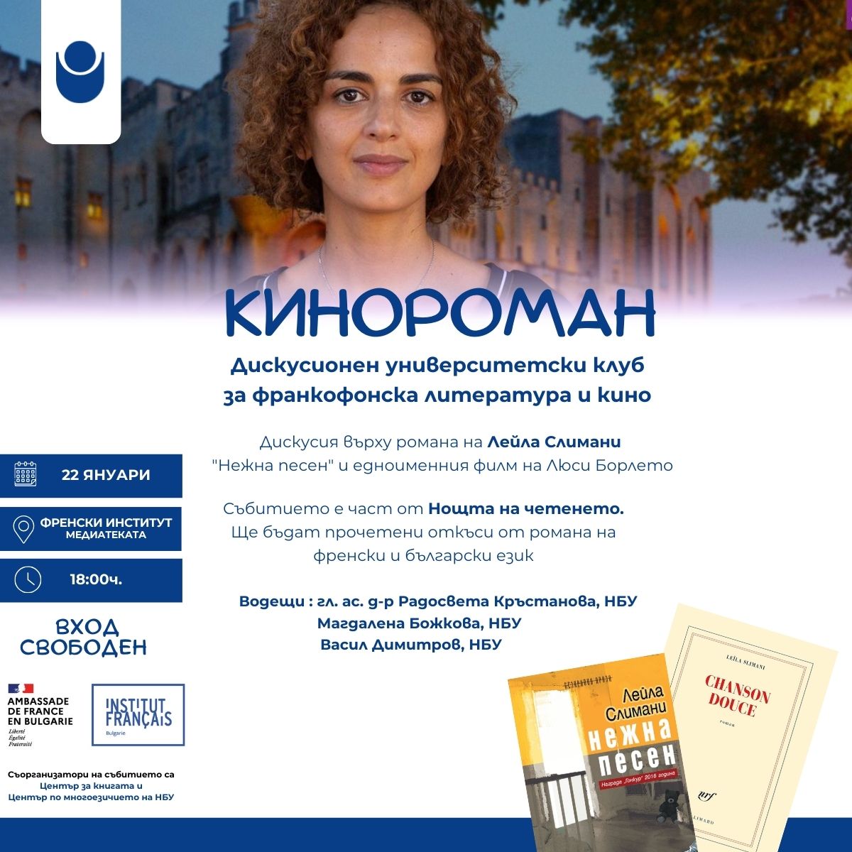 Начало Център за книгата Новини и събития Новини и събития 09 Януари 2026 Литературна дискусия „Кинороман“ около романа „Нежна песен“ на Лейла Слимани и неговата филмова адаптация Френски институт в България