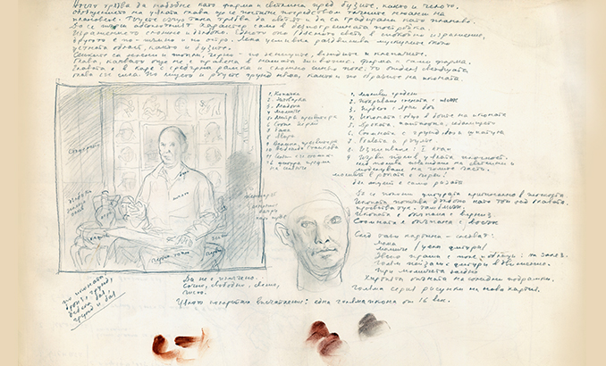 - Изображения на оригинални работни рисунки на Васил Стоилов, представящи началните фази на неговата работа върху различни теми.