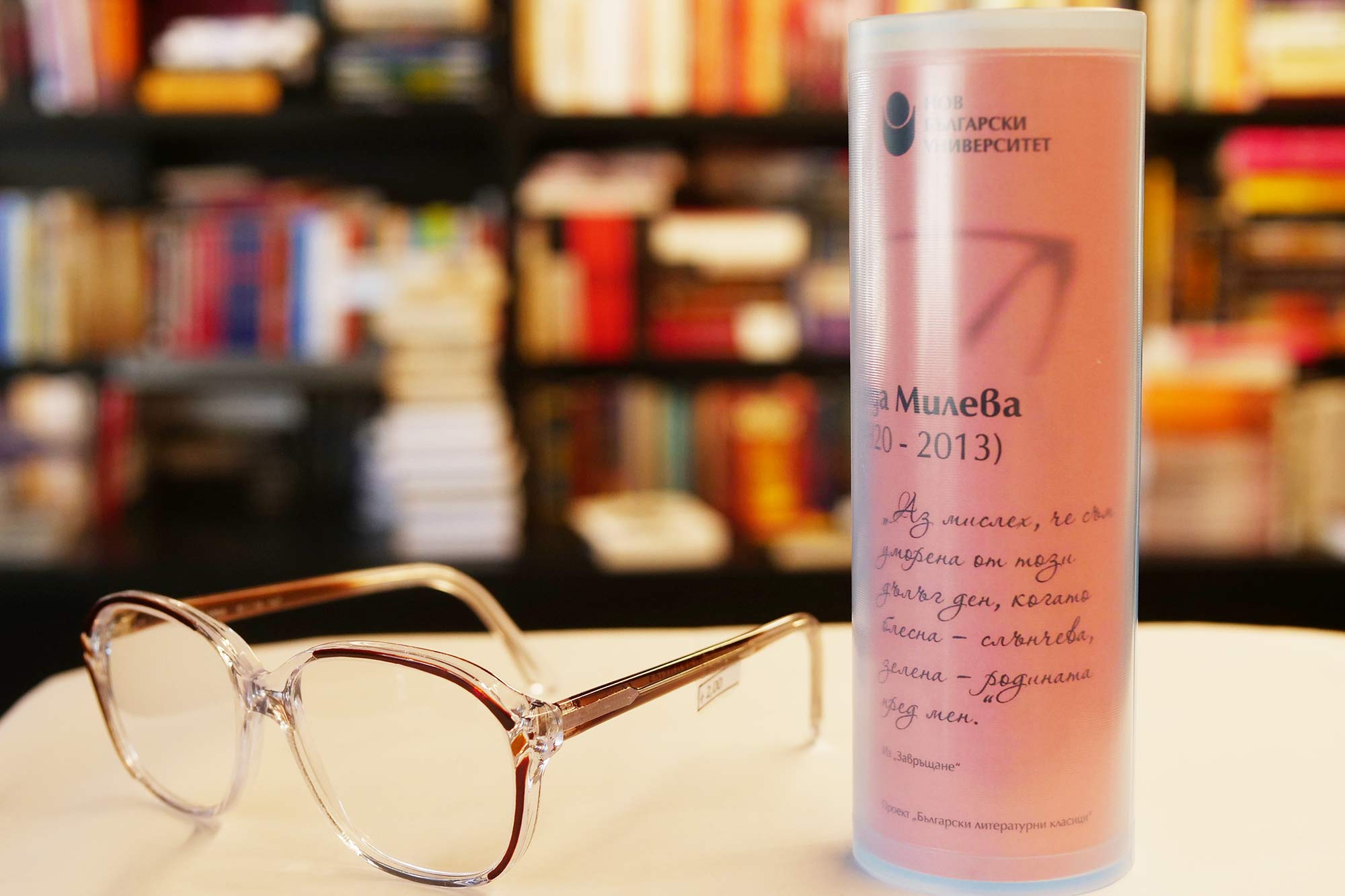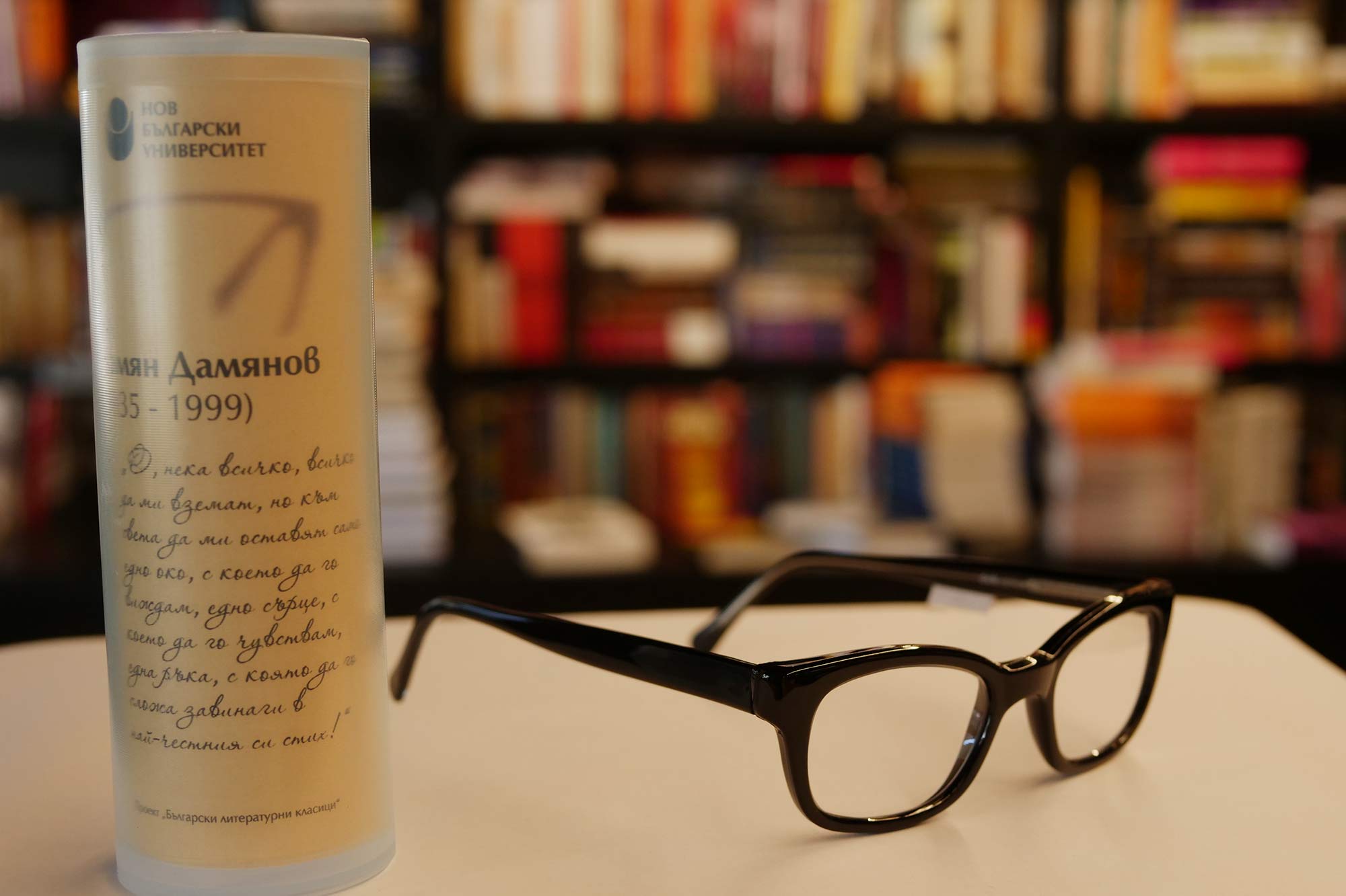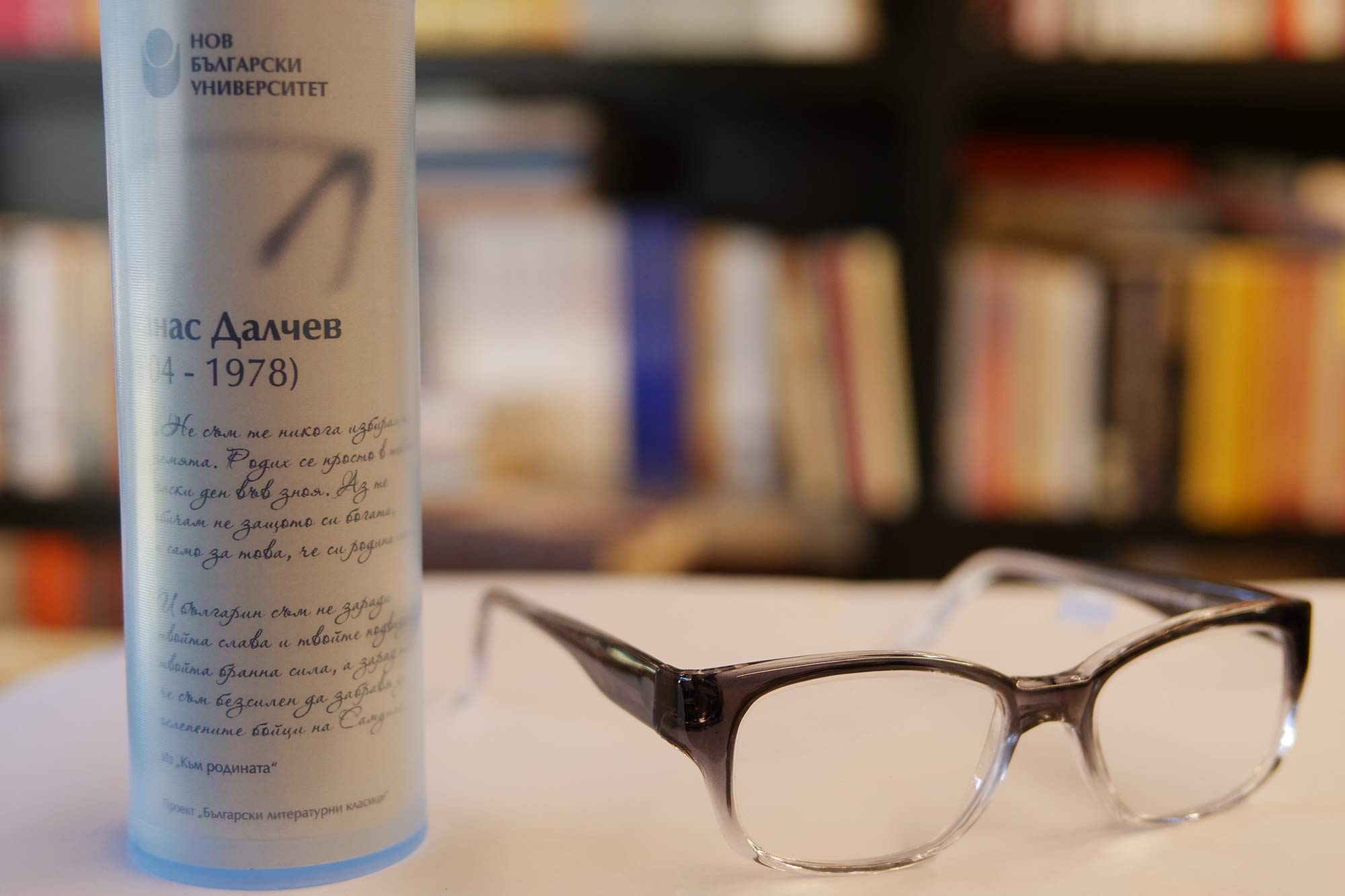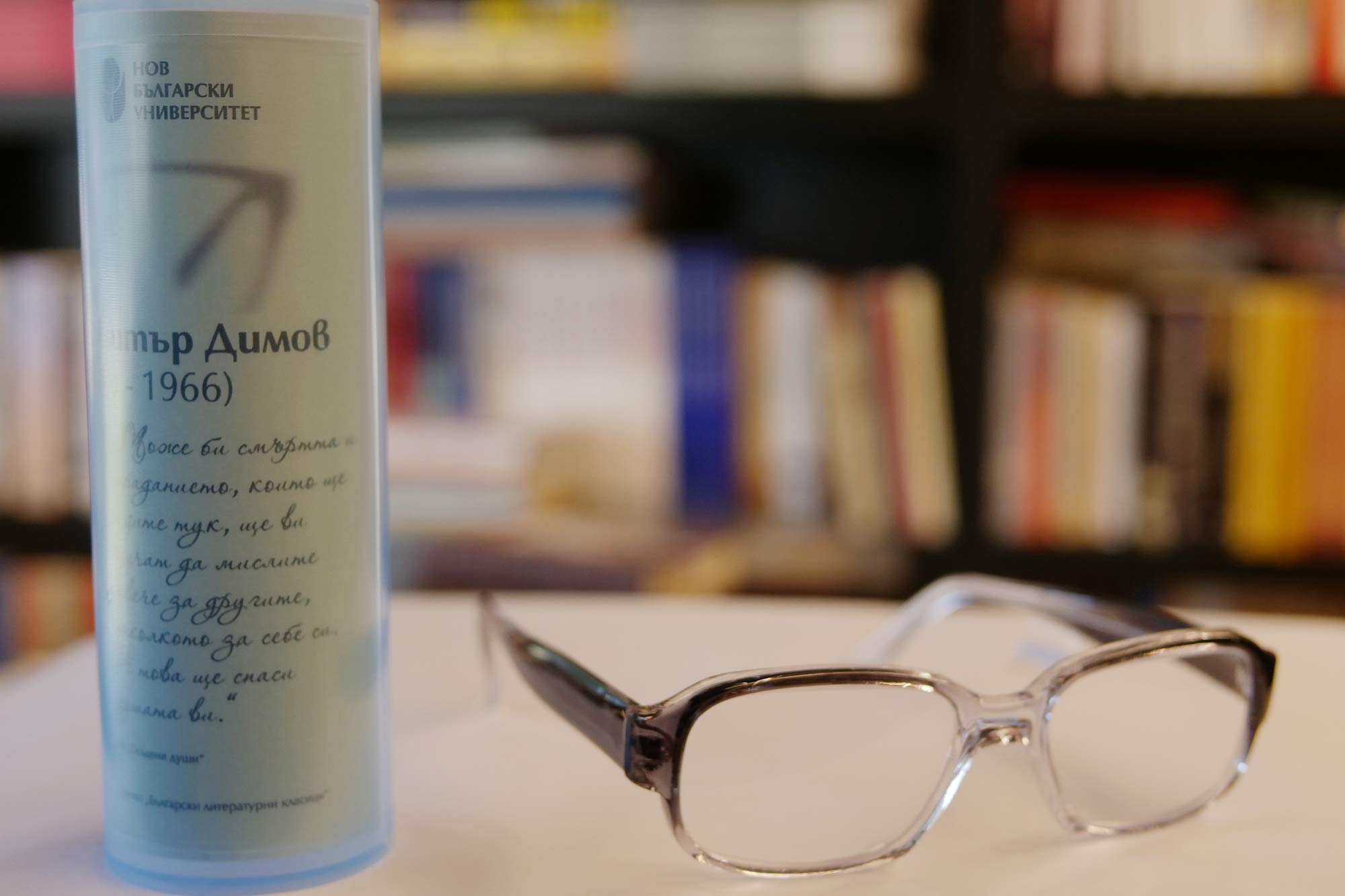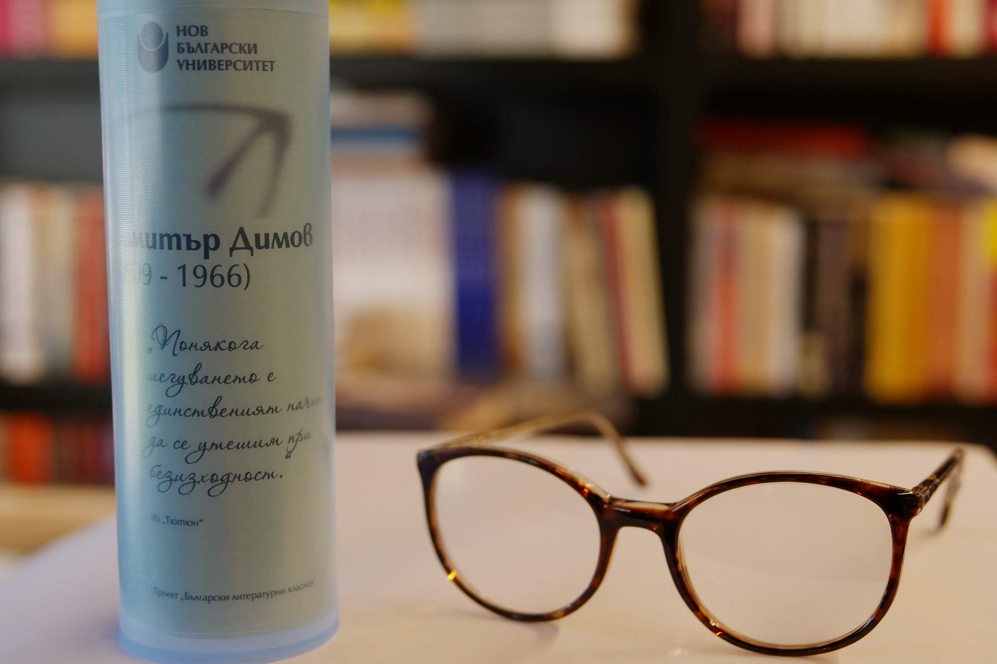 По повод световния Ден на книгата и авторското право Нов български университет продължава да развива инициативата, чийто нов етап е насочен към младите хора. Те могат да си изберат очила без диоптър, с антирефлексни стъкла и лещи, които защитават окото. Очилата, копия на носените от българските класици, могат да бъдат закупени от книжарниците на НБУ, както и от електронната книжарница на университета. Всеки закупен чифт дава възможност за ползване на 10% отстъпка при покупка на 6 избрани заглавия от български автор.
