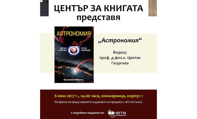Начало Център за книгата Новини и събития Новини и събития 02 Юни 2017 Представяне на „Астрономия“ от проф. д.физ.н. Цветан Георгиев и доц. д-р Петко Недялков Аз чета