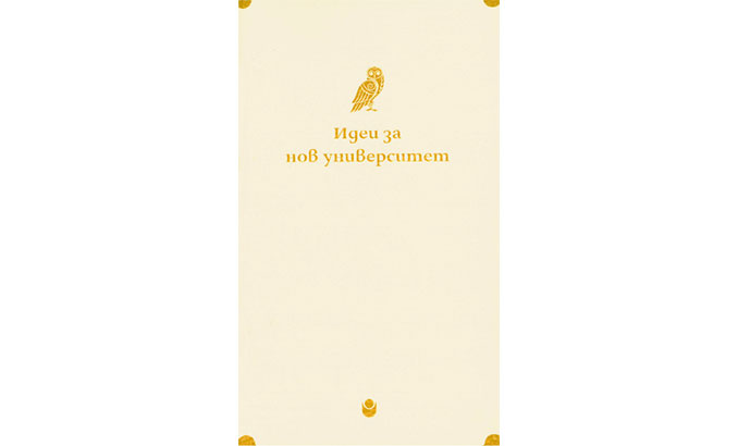 Текстовете тук произхождат от всекидневието и от празника, от същностното битие на университета. Това е своеобразна антология на идеите за нов университет, появили се през последните 30 години заедно с раждането, растежа и утвърждаването на НБУ. Книга, която се стреми да събере и пренесе между две корици послания, които ще ни напомнят за пътя от вчера, ще ни дават по-точни ориентири днес и може би ще ни предлагат отговори на въпроси, които – кой знае – ще си задаваме утре.