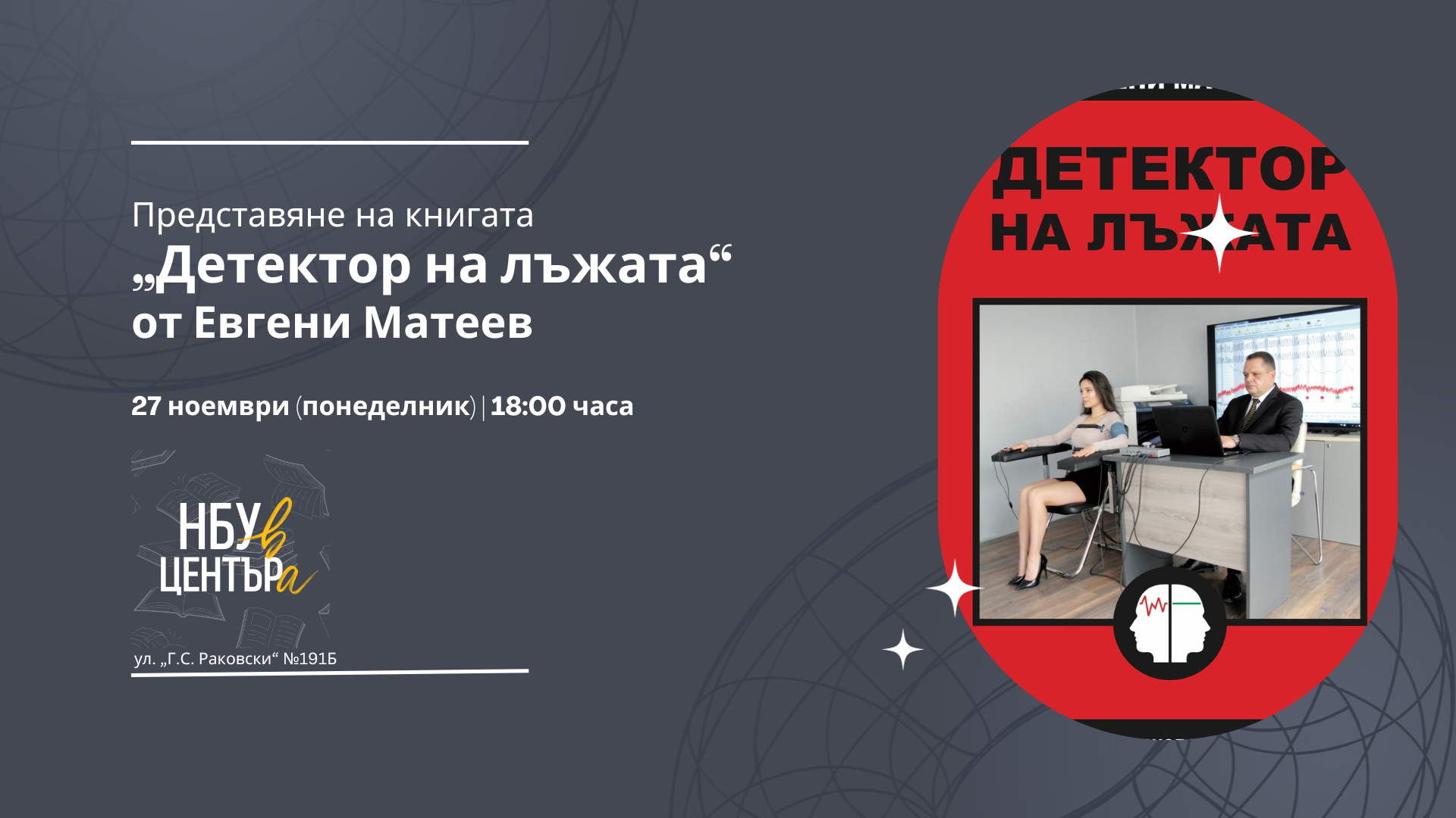 Книжарница и галерия „НБУ в ЦЕНТЪРа“, 27 ноември 2023 г., 18.00 ч. Събитието е с водещ Диана Николова от Център за психофизиологични изследвания „Детектор на лъжата“