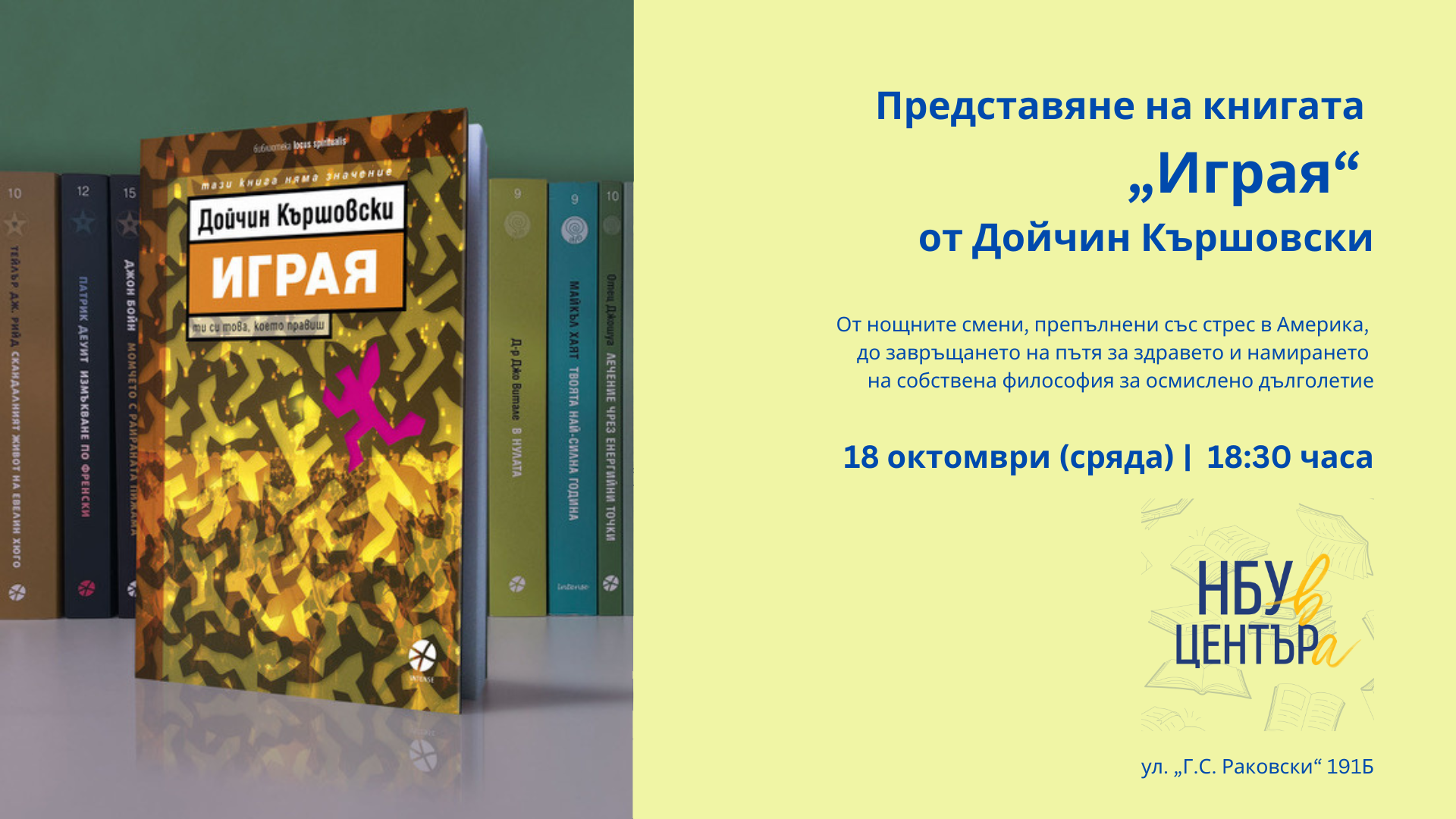 Книжарница и галерия „НБУ в ЦЕНТЪРа“, 18 октомври 2023 г.,18.30 ч. В тази книга не става въпрос само за това как да бъдем здрави или как да изглеждаме добре. „Играя“ е покана за по-дълбока степен на човечност, за ново разбиране на живота като Игра...