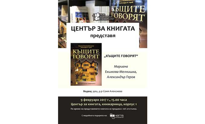 Начало Център за книгата Новини и събития Новини и събития 09 Февруари 2017 Представяне на „Къщите говорят“ от Мариана Екимова-Мелнишка и Александър Геров Аз чета