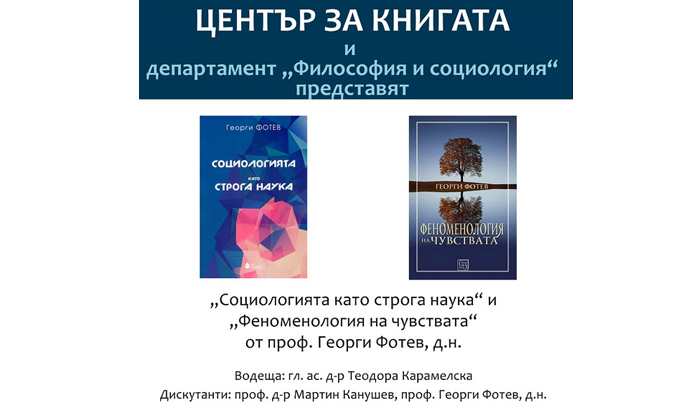 Начало Център за книгата Новини и събития Новини и събития 29 Ноември 2018 Представяне на „Социологията като строга наука“ и „Феноменология на чувствата“ от проф. Георги Фотев Аз чета