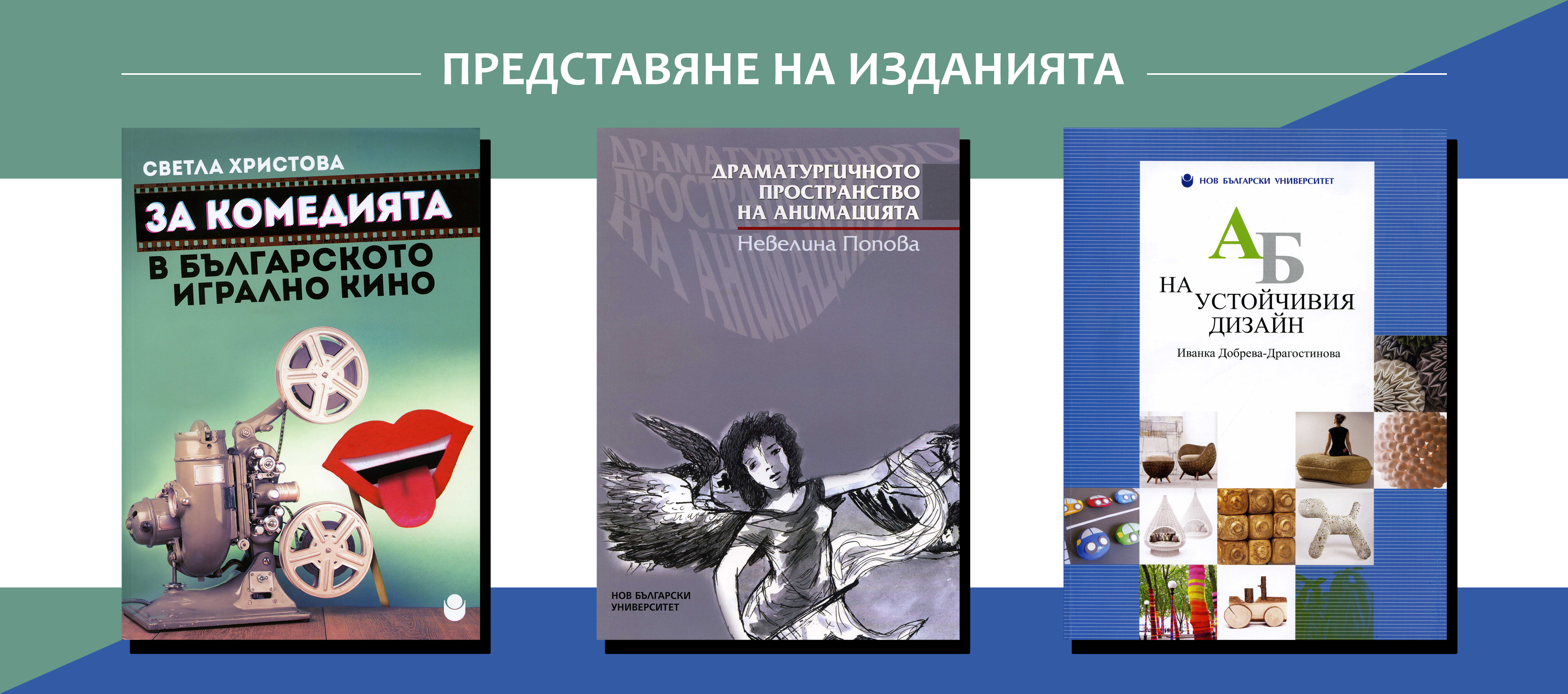 Представяне на книгите: „За комедията в българското игрално кино“ с автор доц. д-р Светла Христова, „Драматургичното пространство на анимацията“ на доц. д-р Невелина Попова и „АБ на устойчивия дизайн“ с автор гл. ас. д-р Иванка Добрева-Драгостинова
