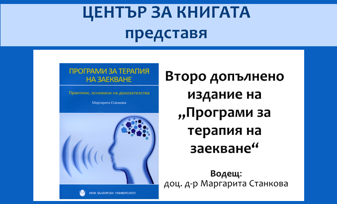 Начало Център за книгата Новини и събития Новини и събития 07 Февруари 2018 Представяне на второ допълнено издание „Програми за терапия на заекване“ от доц. д-р Маргарита Станкова Аз чета Allevents.in