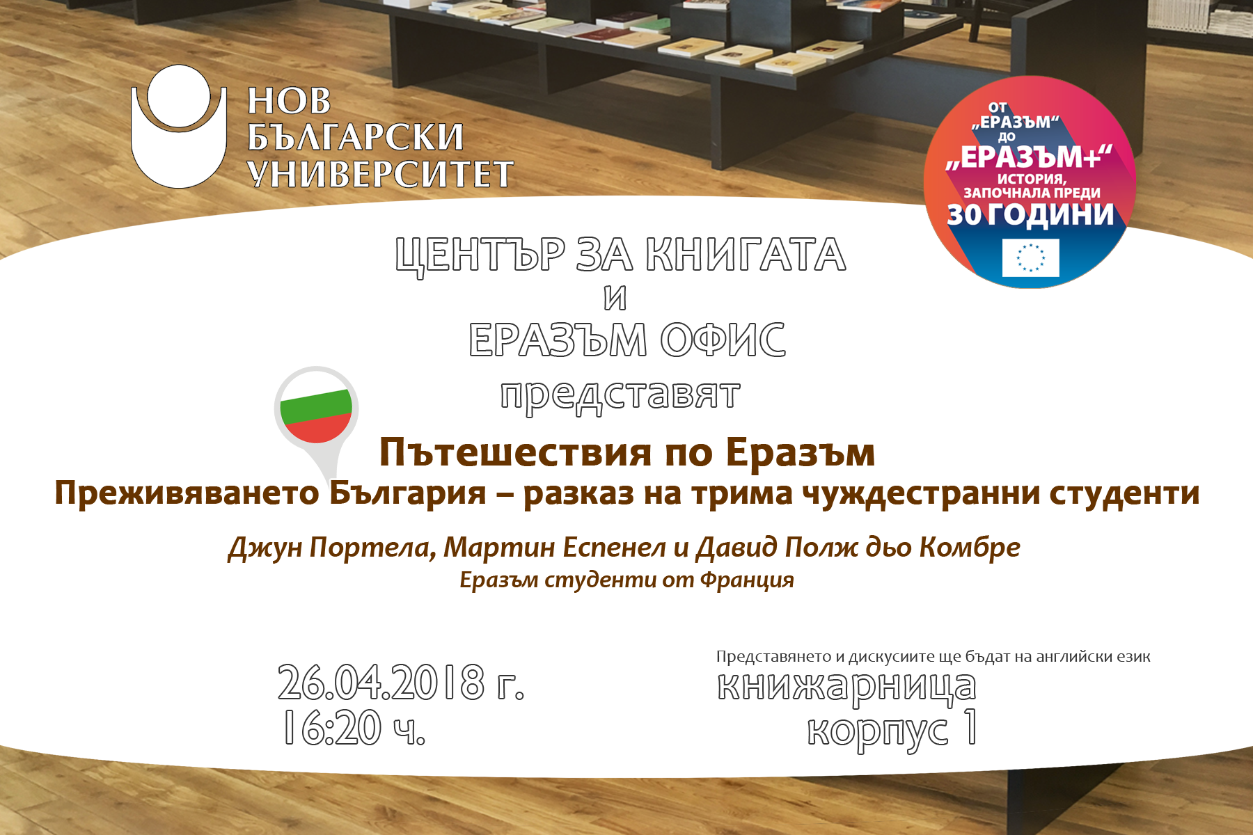 Програма „Еразъм“, дала възможност на над 5 милиона млади хора да учат в чужбина чрез студентски обмен, през 2017 г. отбеляза 30-ата си годишнина. Това е повод за иницииране на поредица от срещи под надслов „Пътешествия по Еразъм“ в НБУ, на които ще имате възможността да чуете различни интересни преживявания на студентите и преподавателите, които са участвали в европейската програма.