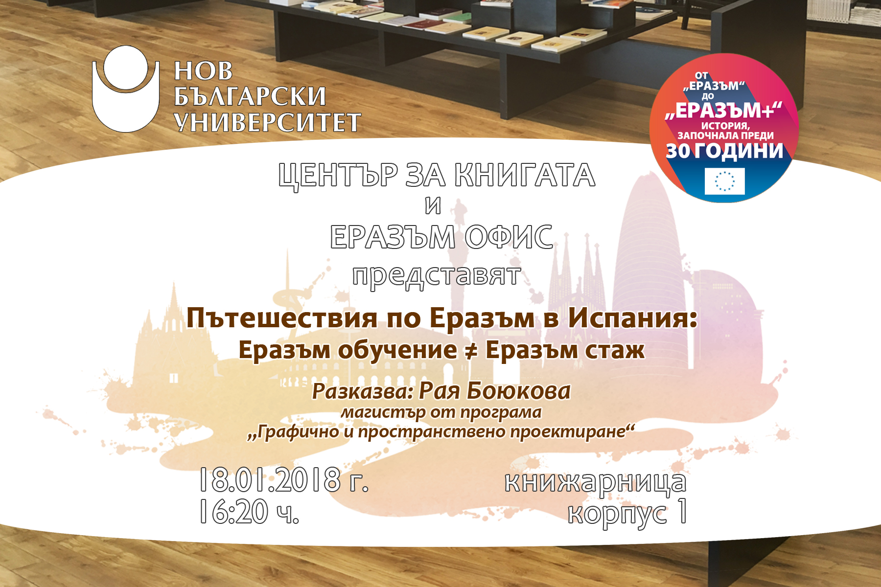 Център за книгата и Еразъм офис на Нов български университет ви канят на среща „Пътешествия по Еразъм в Испания: Еразъм обучение ≠ Еразъм стаж“ на 18. януари 2018 г. от 16:20 ч. в книжарницата на корпус 1.