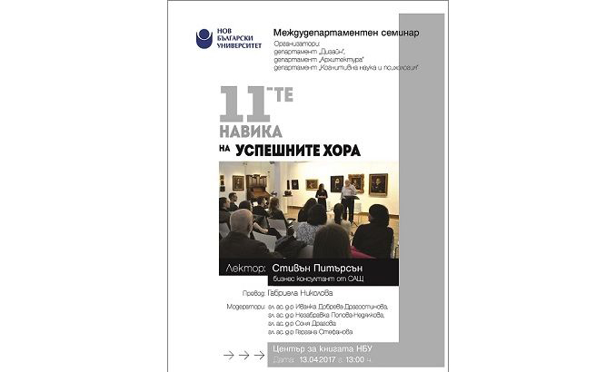 Начало Център за книгата Новини и събития Новини и събития 07 Април 2017 Семинар „Единадесетте навика на успешните хора“ 13 април 2017 г., 13.00 ч., Нов български университет, Център за книгата, книжарницата на корпус I Културни новини