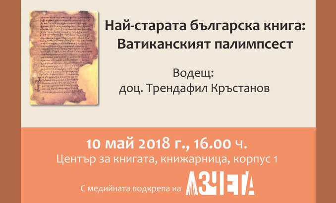 Начало Център за книгата Новини и събития Новини и събития 10 Май 2018 Семинар „Най-старата българска книга: Ватиканският палимпсест“ Културни новини Снимка: Аз чета